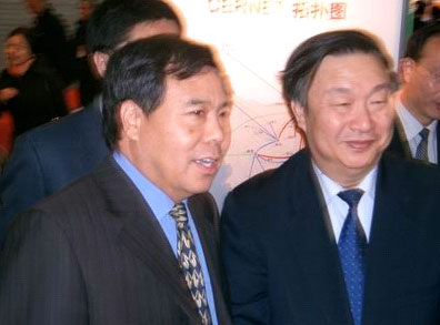 (圖為信產(chǎn)部部長王旭東在教育部科技發(fā)展中心主任李志民陪同下參觀CERNET展示區(qū)) ![]() |
